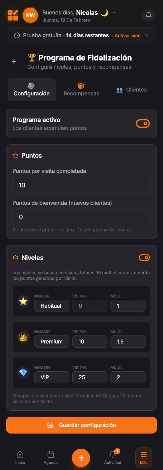 Sistema de fidelidad opcional. Lo activás cuando quieras.