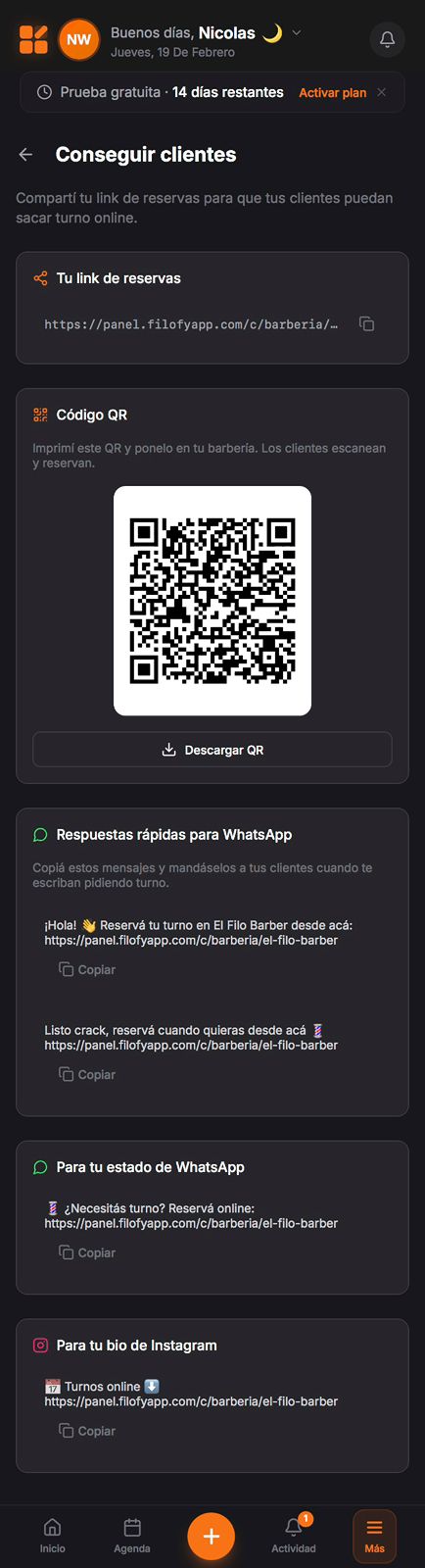 Filofy te genera un link y un QR únicos. Pasalo por WhatsApp, Instagram, o ponelo en tu local.