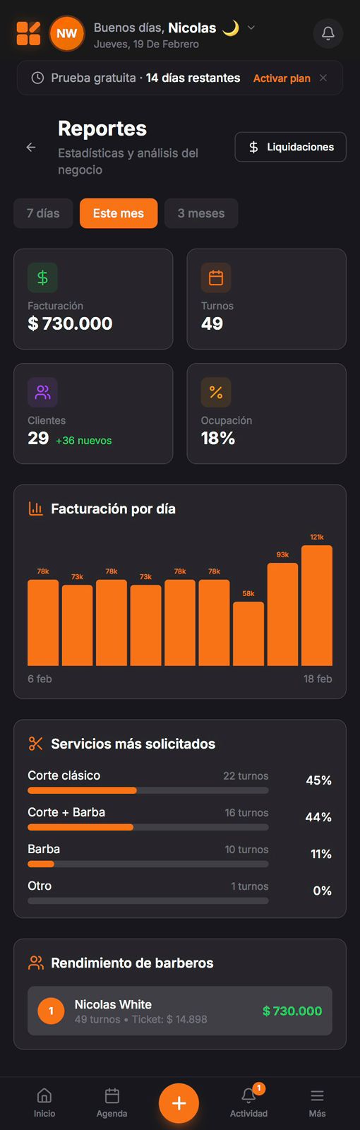 Turnos del día, ingresos de la semana, clientes nuevos, retorno sobre tu inversión. Todo en una pantalla. Actualizado en tiempo real.